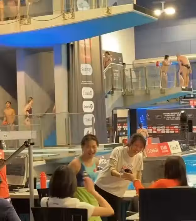 給她倆拍照的人是陳若琳,這三代跳水冠軍,鬆弛和諧的畫面,緩解了比賽現場緊張的氣氛。