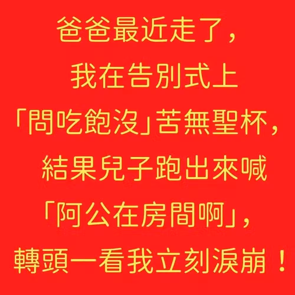 爸爸最近走了,我在告別式上「問吃飽沒」苦無聖杯,結果兒子跑出來喊「阿公在房間啊」,轉頭一看我立刻淚崩