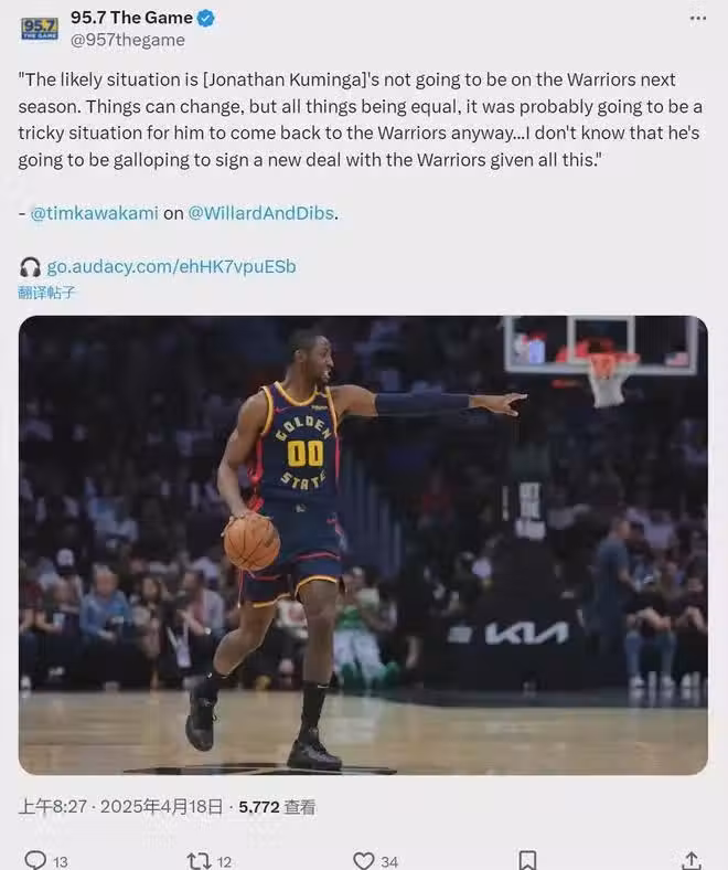 4月18日上午,據勇士記者Tim Kawakami報道:「庫明加下賽季很可能不會留在勇士隊了!即使他想回歸勇士,局面恐怕也會相當困難。」過去兩場關鍵的比賽,包括常規賽收官戰和附加賽,庫明加慘遭DNP,一分鐘都沒打。