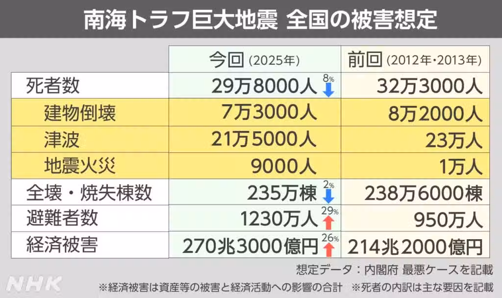 並首度試算,「災害關聯死」最多將達5萬2千人,恐遇上避難時的疲勞與疾病死亡;而人口較多的東海地區,傷者與避難者人數最多分別為95萬與1230萬人。