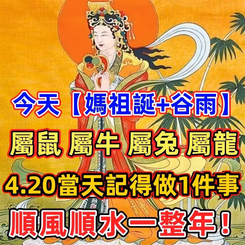 百年難得一見!【媽祖誕+穀雨】,生肖屬鼠、牛、兔、龍 4.20日當天做1事,順風順水一整年!