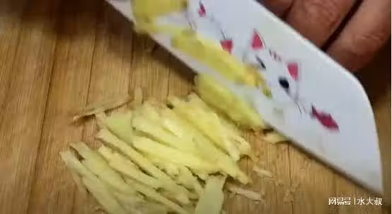姜浸泡好以後先切成薄片,再切成薑絲,裝入盤中備用。
