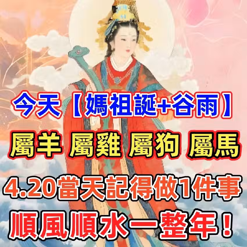 百年難得一見!【媽祖誕+穀雨】,生肖屬羊、雞、狗、馬 4.20日當天做1事,順風順水一整年