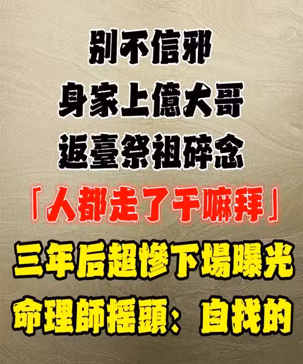命理大師江柏樂就在臉書分享一項案例,曾有位身家上億的男子,在家中排行老大,一次掃墓時不滿的喊道:「人都走了幹嘛還拜?」結果3年後下場超慘...