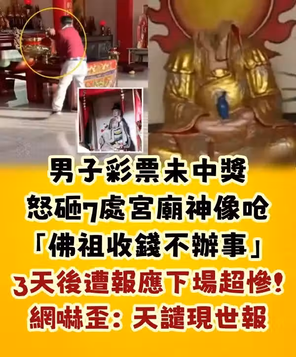 男子彩票未中獎,怒砸7處宮廟神像嗆「佛祖收錢不辦事」3天後遭報應下場超慘!網嚇歪:天譴現世報