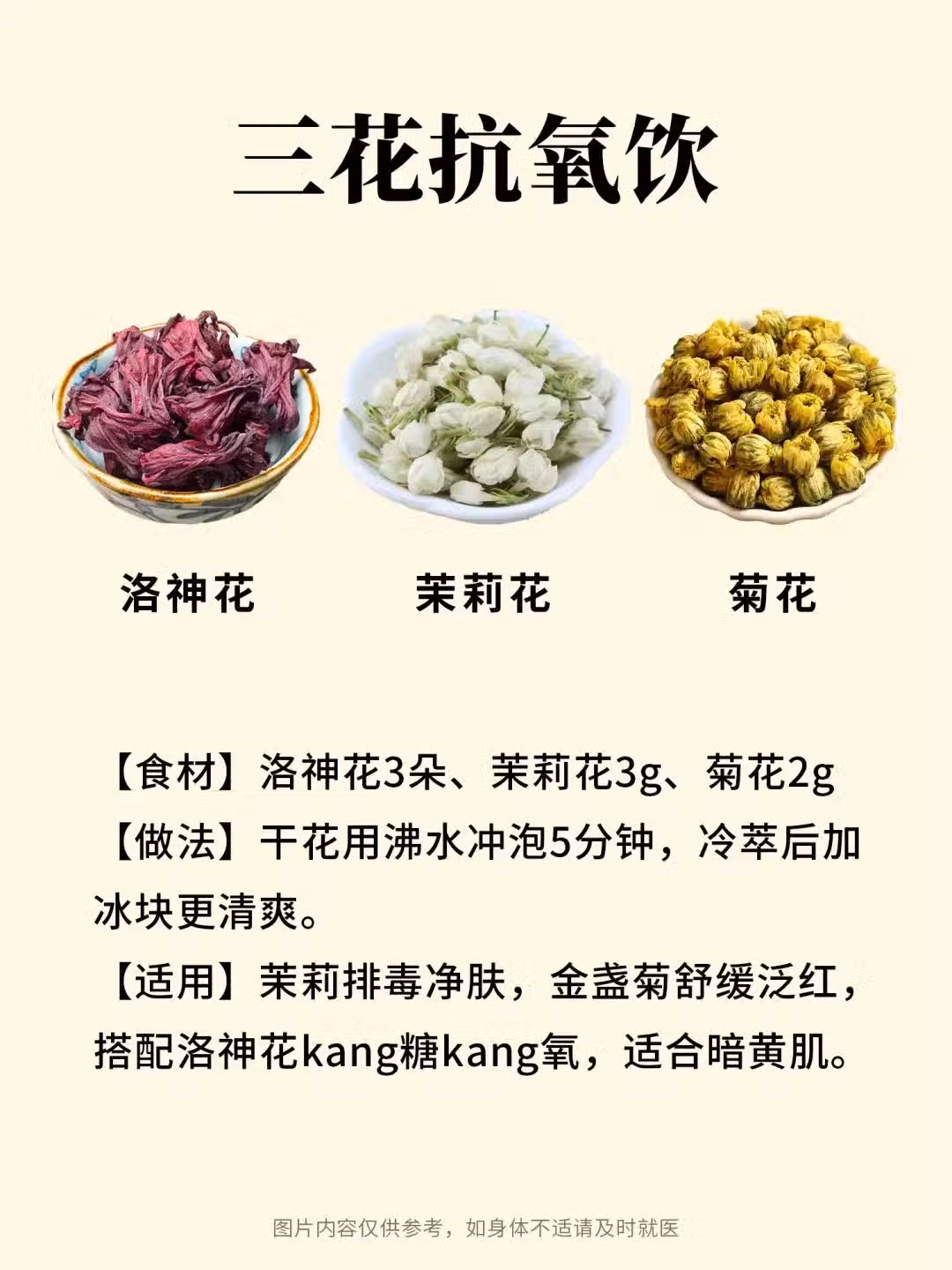 洛神銀耳膠原羹:功效:抗老補水王炸 配方:洛神花2朵+銀耳羹+膠原蛋白肽粉 亮點:銀耳的植物膠質與洛神花酸形成「天然玻尿酸」,建議妝前飲用,能讓底妝更服帖,長期喝法令紋處會有微微膨潤感