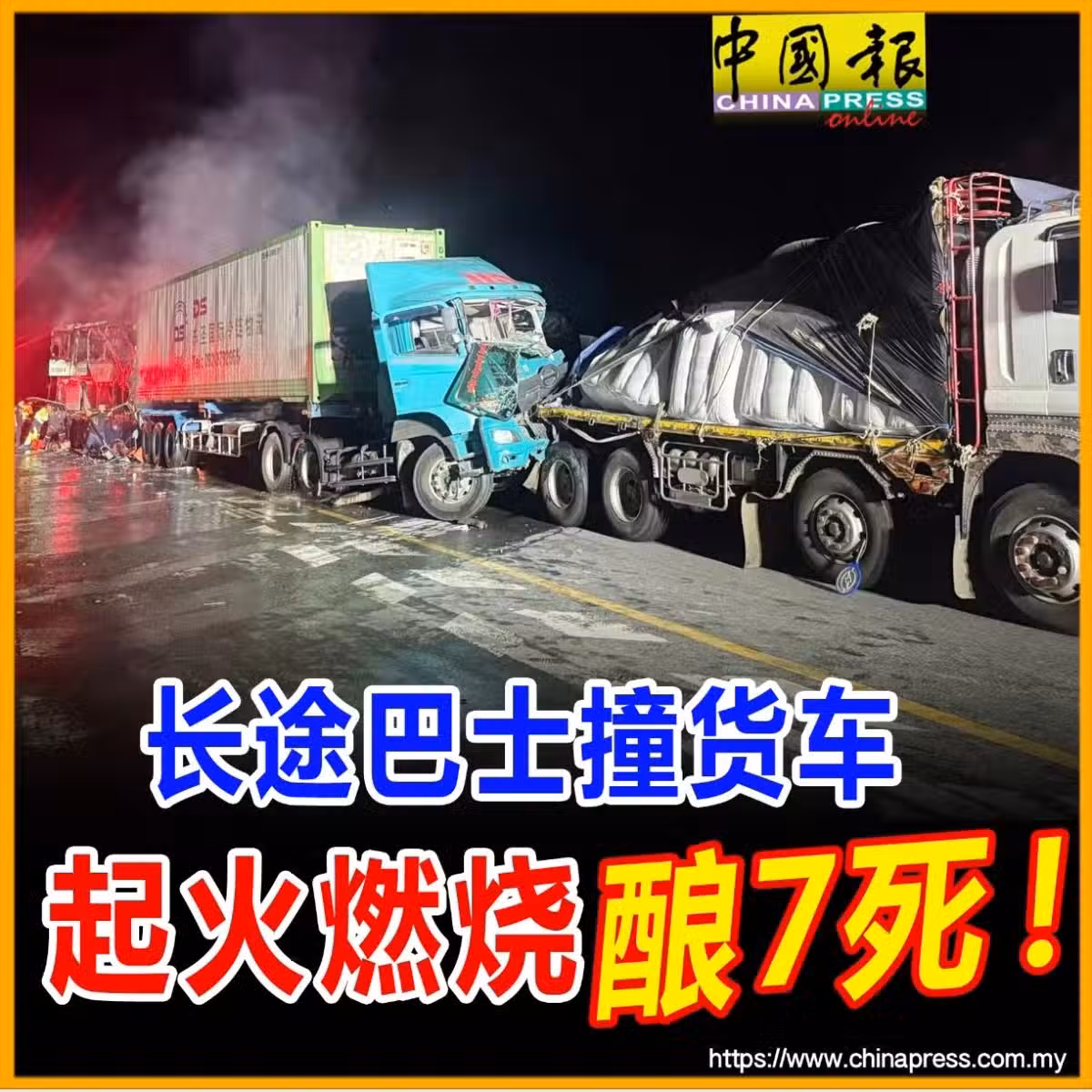 (曼谷21日綜合電)泰國中部巴真府周一清晨發生嚴重車禍,一輛長途客運巴士在高速公路上疑似剎車失靈,撞上大貨車後起火燃燒,造成7人死亡、至少40人受傷。