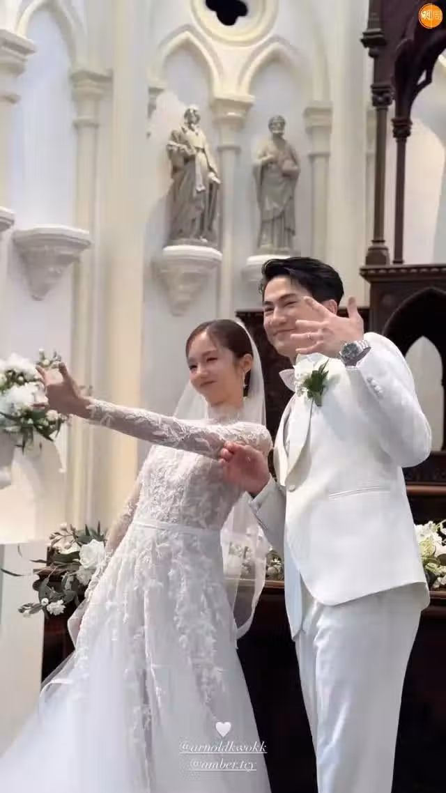 晚上,一對新人現身會見傳媒,鄧卓殷以一身白色大露背魚尾禮服現身,大曬玉背同長腿,兩人大擺造型合影,郭子豪則全程摟著老婆纖腰,又甜蜜親吻親足半分鐘,大方放閃!