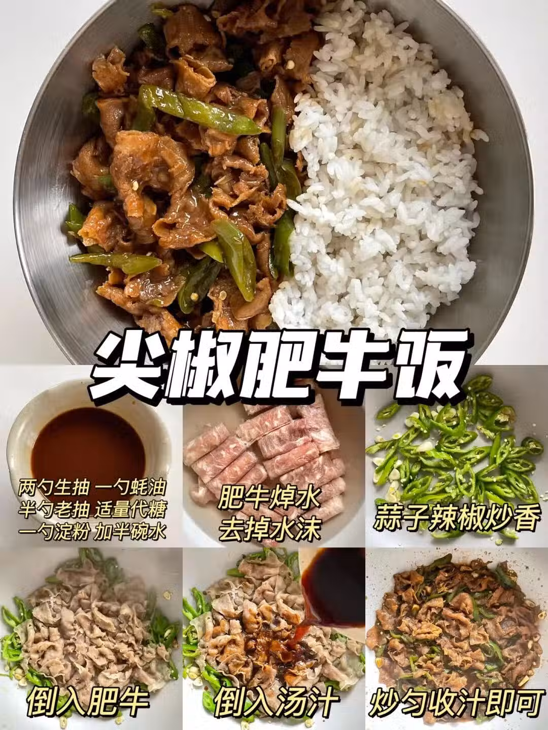 準備食材:青椒、蒜末、肥牛 配料:生抽、蚝油、老抽、代糖、澱粉 做法步驟:準備料汁:生抽、蚝油、老抽、代糖、澱粉加半碗水攪拌均勻備用;先將肥牛焯水,去掉浮沫撈出;油熱下蒜末爆香,放入青椒翻炒,加入肥牛,倒入調好的料汁,翻炒均勻收汁即可。