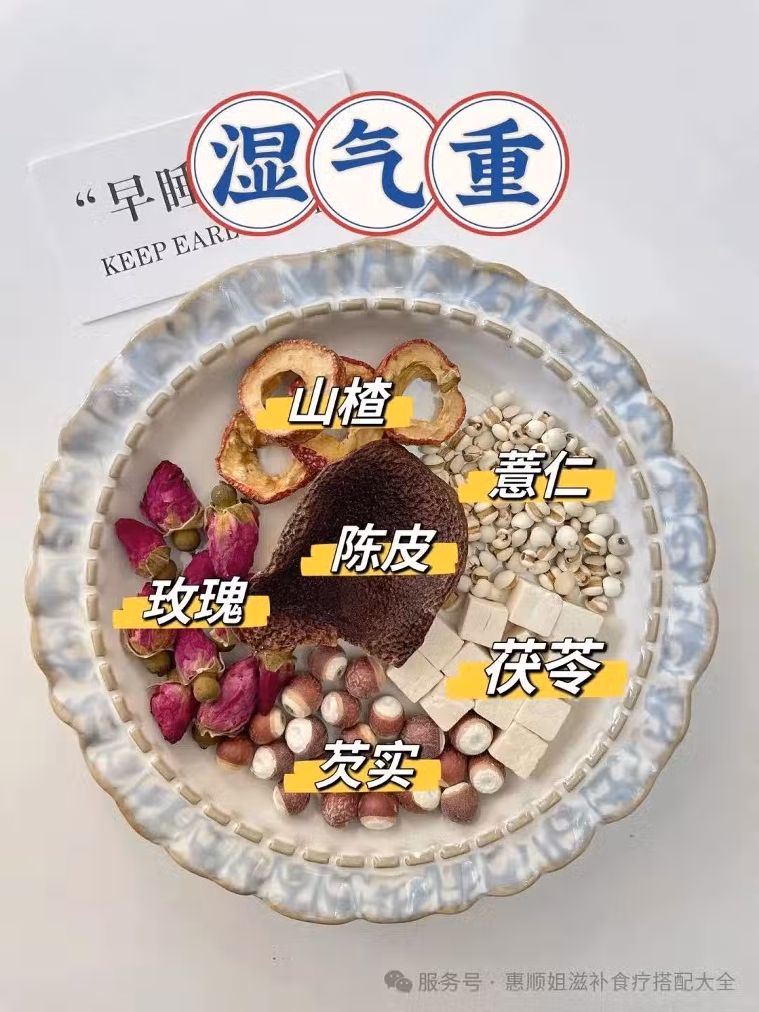 🍵 茯苓10克、山楂5克、芡實10克、玫瑰花2朵、陳皮3克、薏米10克