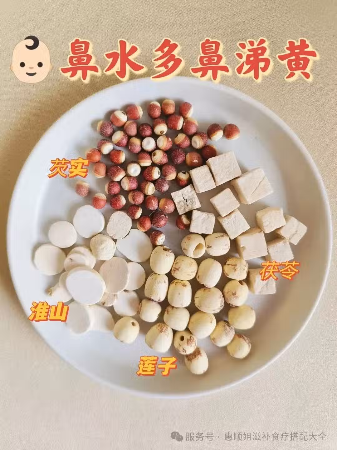 ✅鼻塞流鼻水:芡實10克、淮山10克、茯苓10克、蓮子10克