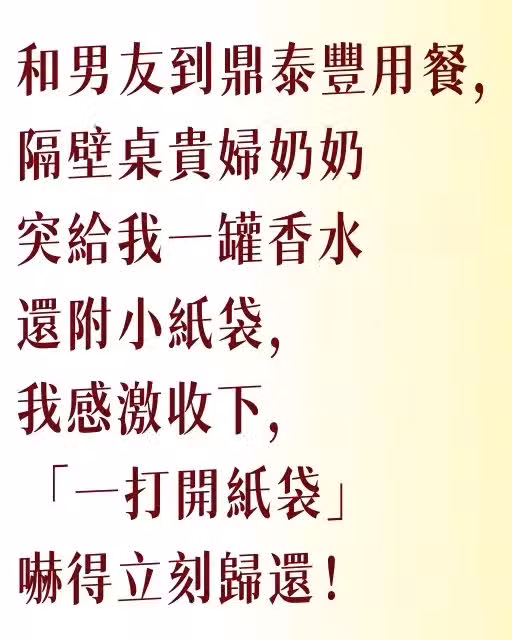 和男友到鼎泰豐用餐,隔壁桌貴婦奶奶突給我一罐香水還附小紙袋,我感激收下,「一打開紙袋」嚇得立刻歸還