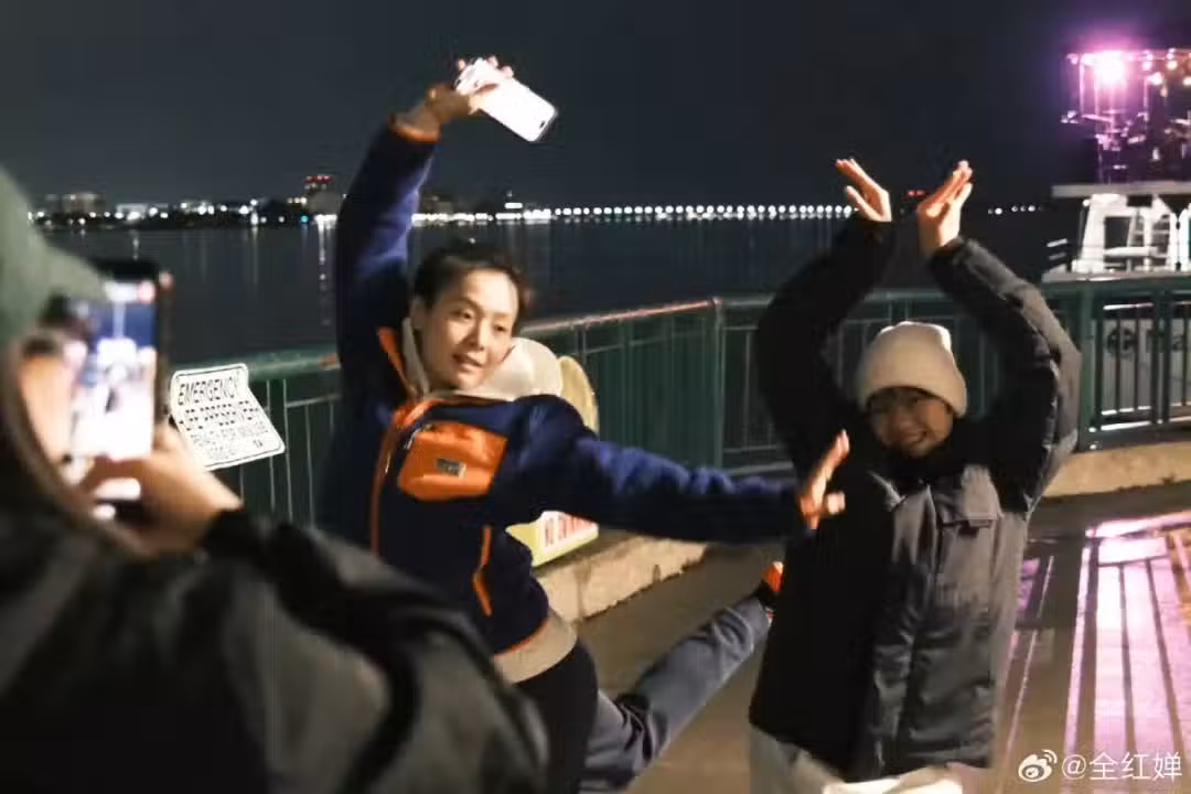與熊姐在一起的全紅嬋,化身一位小萌妹,帶著白色帽子更是可可愛愛,更是依偎在熊姐身上。