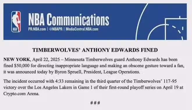 本賽季至今,愛德華茲已累計被罰款超過60萬美元......不過對於年薪高達4218萬美元的他來說,就是九牛一毛,壓根沒法對其產生懲戒作用。