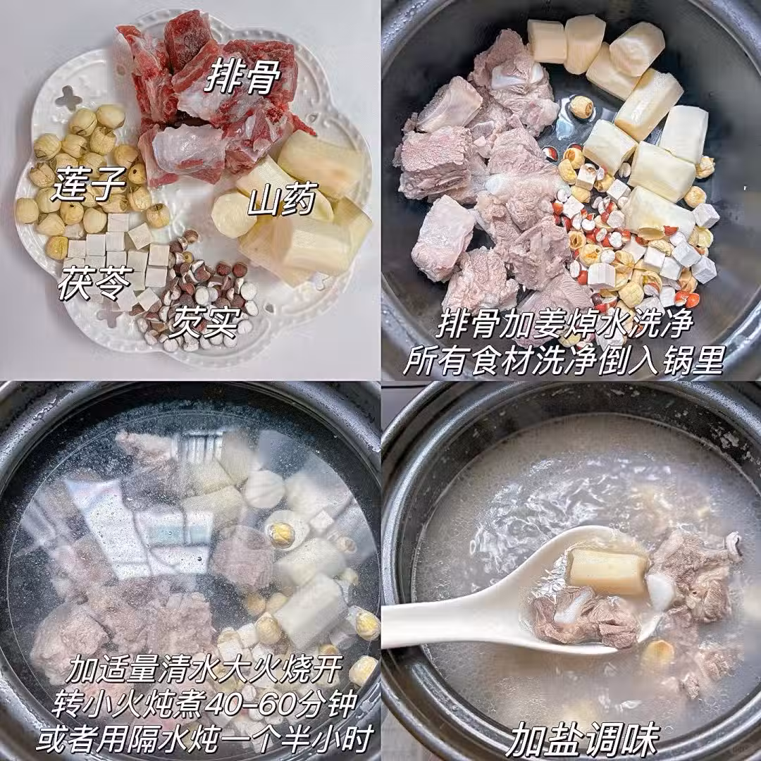 做法: 排骨加姜焯水洗凈 芡實茯苓蓮子洗凈浸泡一會兒 所有食材放入砂鍋煲40—60分鐘或者用隔水燉一個半小時,出鍋加鹽調味 寶寶脾虛積食 消化不良 瘦小可以試試這道四神湯!
