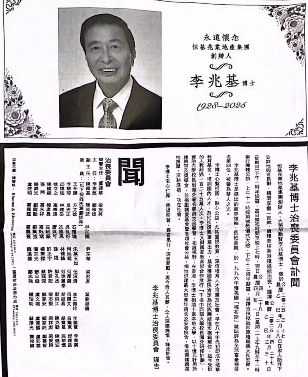 李兆基治喪委員會名單公布,全是香港富商政要,李嘉誠父子沒參與
