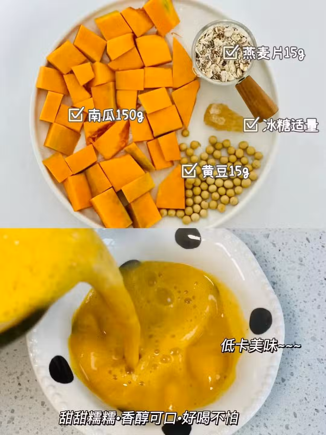 ☑️食材:南瓜150g、燕麥片15g、冰糖適量、黃豆15g