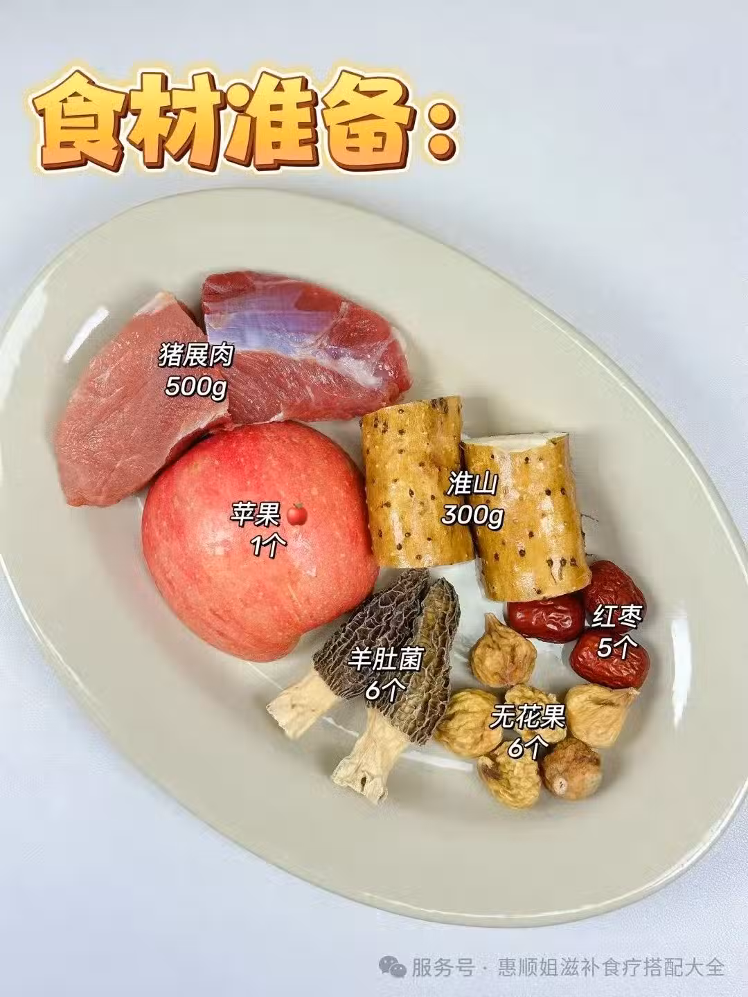 羊肚菌6個、蘋果1個、淮山300g、無花果6個、紅棗5個、豬展肉500g、薑片