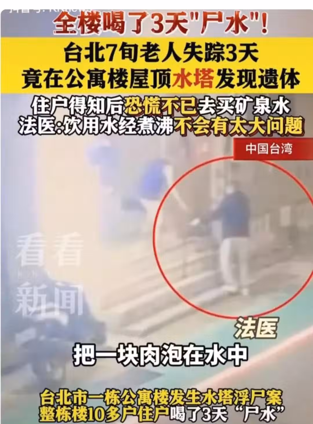 太驚悚!七旬老人泡在樓頂水塔,全樓喝3天「屍水」,法醫:煮沸喝問題不大