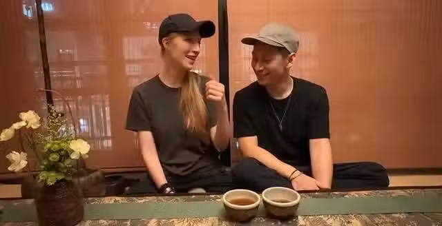 視頻中,駱振偉穿著黑色短袖,打扮簡單。一旁的丹麥妻子,同樣也穿了黑色T恤,頭戴一頂棒球帽。