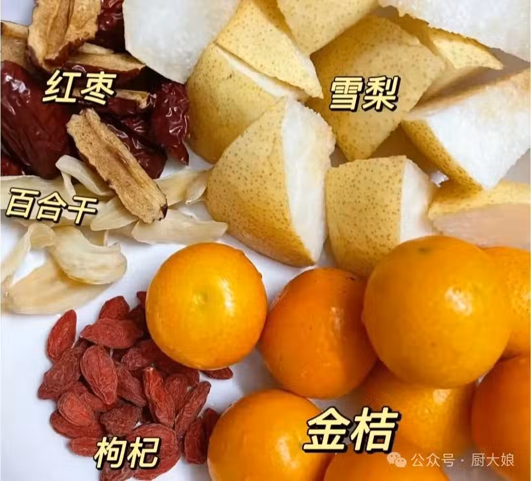 ☘️材料:金桔🍊8個,雪梨🍐1個,紅棗3~5顆,枸杞10克,百合干10克