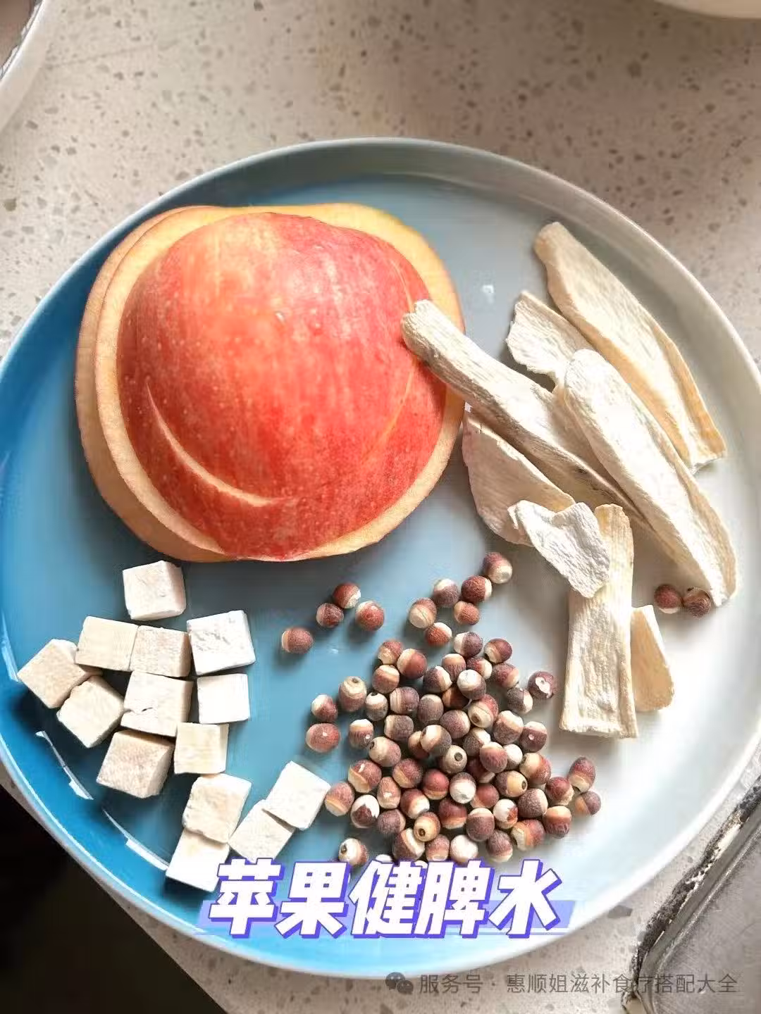 🍎蘋果半個+茯苓15g+芡實15顆+山藥20g,煮20-30分鐘。改良版四神湯,特別適合脾胃虛弱、消化不良的人群,小朋友也可以喝哦!👶