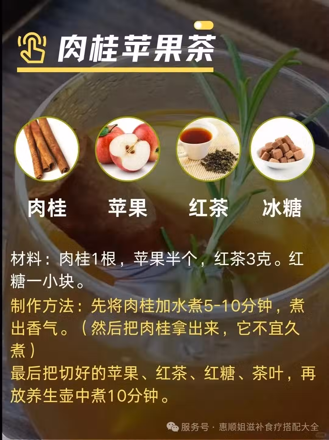 蘋果其本身的酸性,也能收斂肉桂的溫性,可以讓這杯水變得更加溫和。如果女生有月經冷痛、男生腎陽虛,都可以常喝這個茶。
