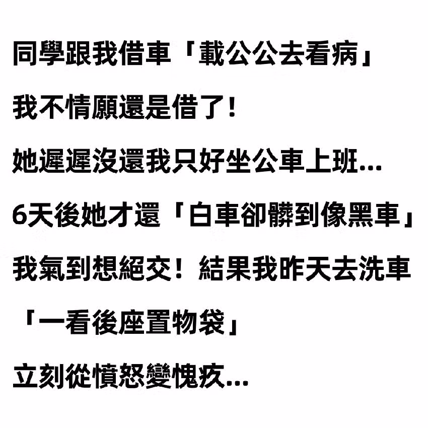 同學跟我借車「載公公去看病」我不情願還是借了! 她遲遲沒還我只好坐公車上班...6天後她才還「白車卻髒到像黑車」我氣到想絕交!結果我昨天去洗車「一看后座置物袋」立刻從憤怒變愧疚