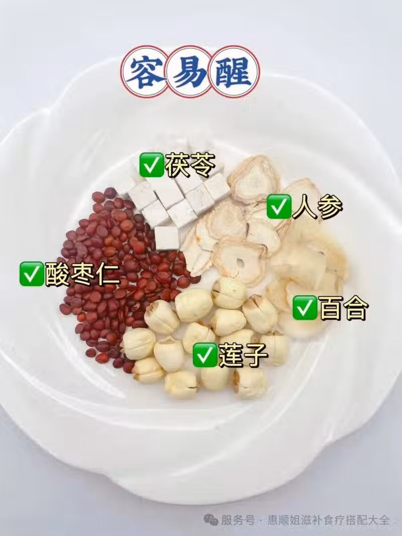 食材:酸棗仁8克、茯苓10克、百合10克、蓮子10克、人參3克