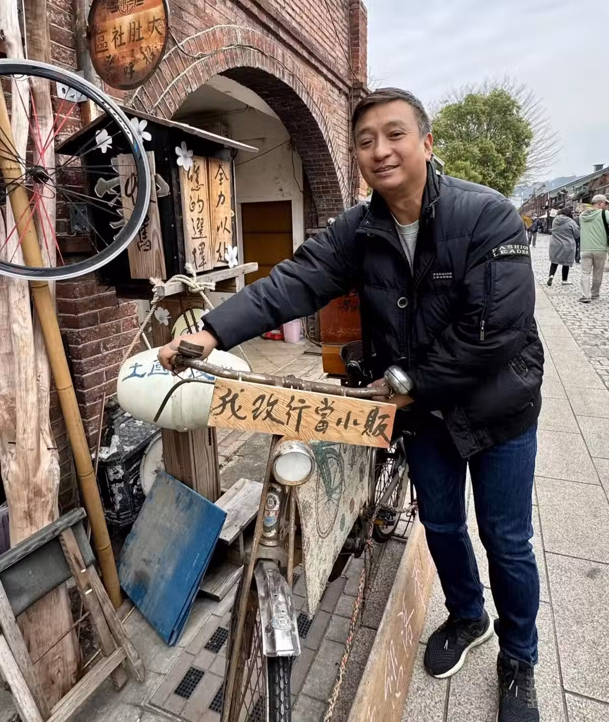 王中平夫妻倆日前到花蓮、新竹等地旅遊,一邊遊玩、一邊記錄美好時光,余皓然在「王中平和余皓然愛的小屋」臉書粉專曬出一系列照片,其中一張為王中平站在老街,牽著一台前方掛著「我改行當小販」招牌的腳踏車,余皓然於附文幽默寫下「老王改行了」,還要大家記得到湖口老街捧場。