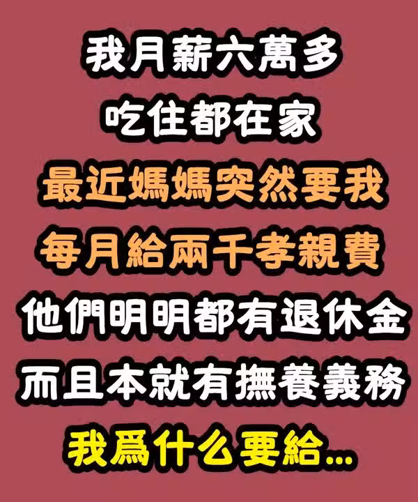 我月薪六萬多,吃住都在家,最近媽媽突然要我「每月給2千孝親費」他們明明都有退休金,而且本來就有撫養義務,我為什麼要給!