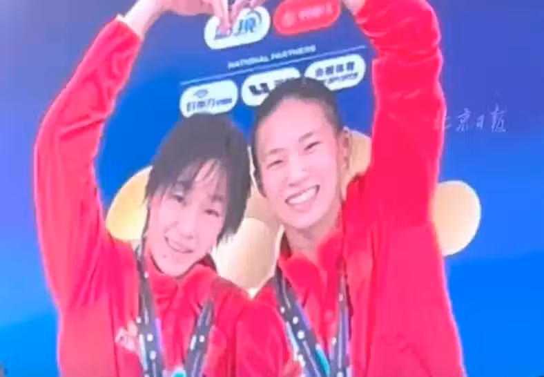 頒獎儀式後,全紅嬋和陳芋汐一起「比心」,並大聲喊出:「我愛北京!」