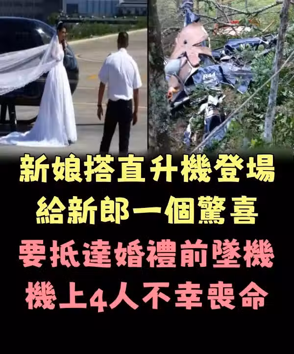 快訊/新娘搭直升機登場給新郎一個驚喜,要抵達婚禮前墜機,機上4人不幸喪命
