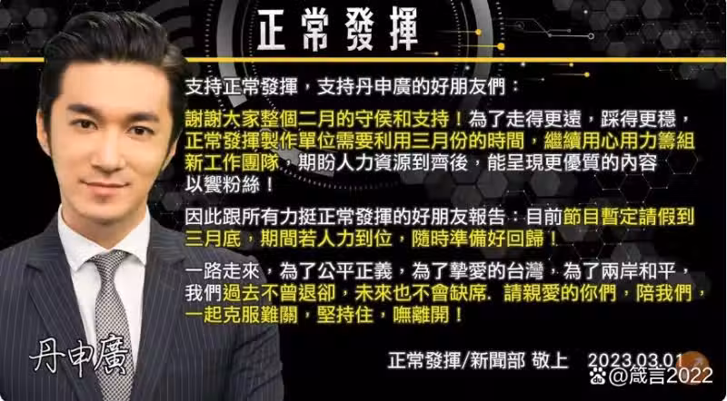 而二月份中天新聞回應表示,節目暫停是因「中天主播主持群輪流休年假,也趁2022和2024兩場大選之間的空檔消化積假」,讓丹申廣好好充電。 不過三月一號《正常發揮》公告則表示,「為了走得更遠,踩得更穩,正常發揮製作單位需要利用三月份的時間,繼續用心用力籌組新工作團隊,期盼人力資源到齊後,能渲染更優質的內容以饗粉絲」! 認了人力不足。