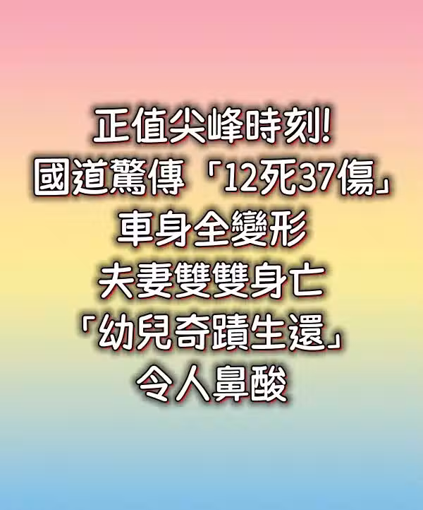 快訊/正值尖峰時刻!國道驚傳「12死37傷」車身全變形 夫妻雙雙身亡「幼兒奇蹟生還」令人鼻酸