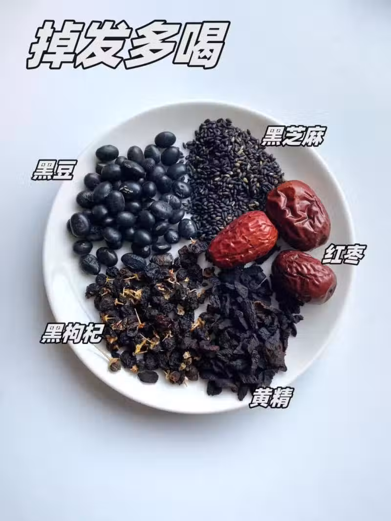 黑豆含植物蛋白、維生素E及卵磷脂,能促進髮根營養供給,增強髮根韌性。黑芝麻富含脂肪酸、含硫胺基酸及微量元素,直接參與頭髮角質蛋白合成,促進頭髮生長。黑枸杞花青素抗氧化清除自由基,枸杞多糖增強免疫力,協同修復毛囊細胞損傷。黃精補氣養陰、益腎填精,針對腎虛型脫髮(腰膝酸軟、頭暈白髮)有顯著改善作用。