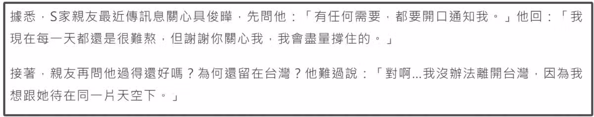 這次爆料的依然是S家的親友,曝光了與具俊曄的對話,他表示自己現在每一天都還是很難熬,謝謝S家的親友關心,承諾會儘量撐住的。據悉,為了陪伴大S,具俊曄時常會去金寶山墓地看望大S,具俊曄也表示自己不想離開台灣省:「因為我想跟她待在同一片天空下。」