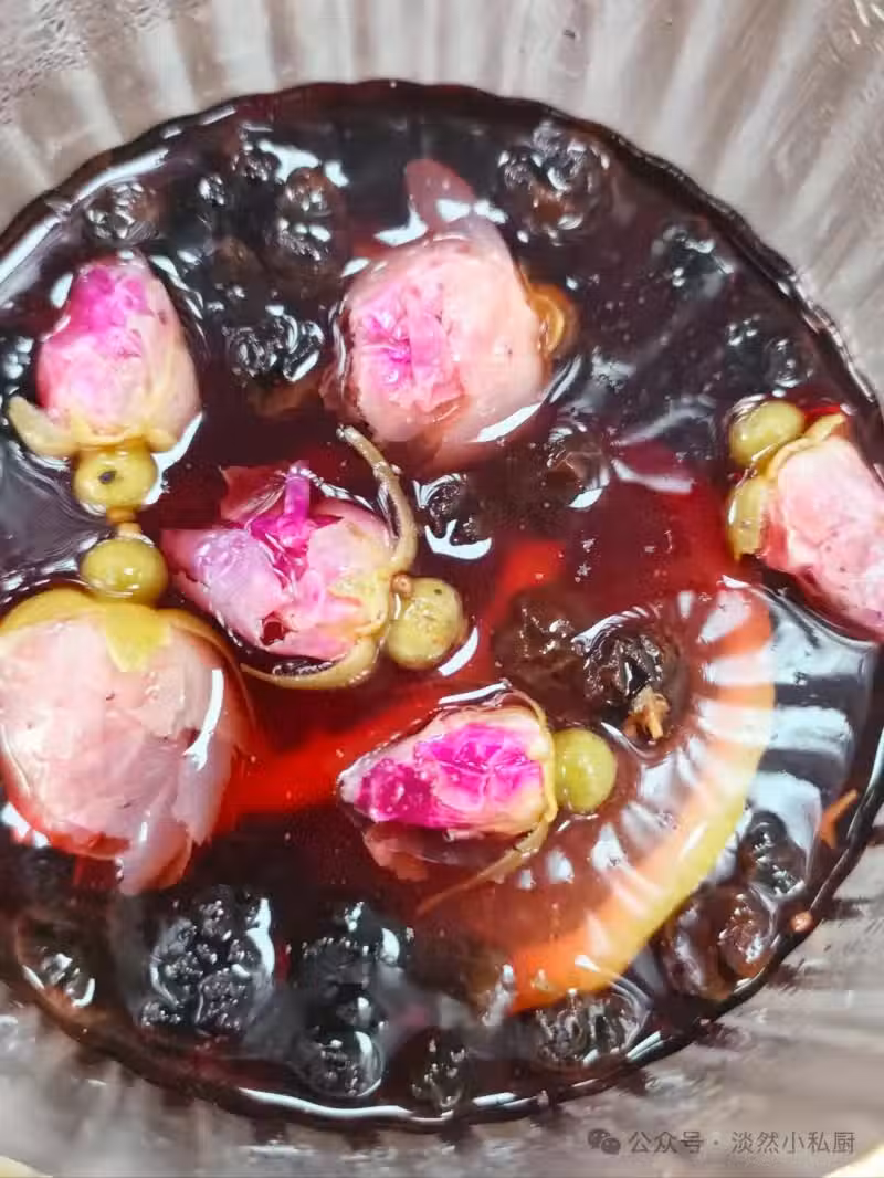 【做法】:將桑葚、玫瑰、黑枸杞放入杯中,水燒開後沖入杯中(也可以待水涼一點點),待水溫降低一些後,再放入檸檬片,靜置5分鐘以上,一杯滿🈵花青素和 VC 的美白內調飲品就大功告成啦~