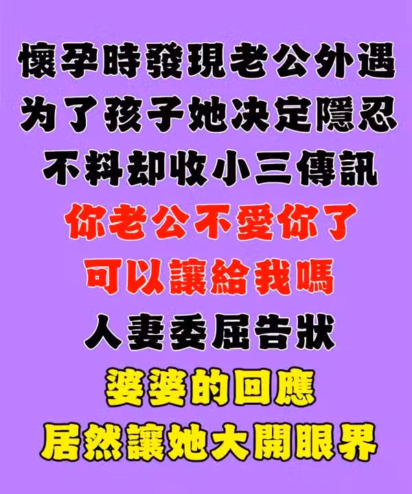 懷孕時發現老公外遇!為孩子隱忍卻收小三傳訊:「你老公不愛你了,可以讓給我嗎」人妻委屈告狀「婆婆回應讓她大開眼界」