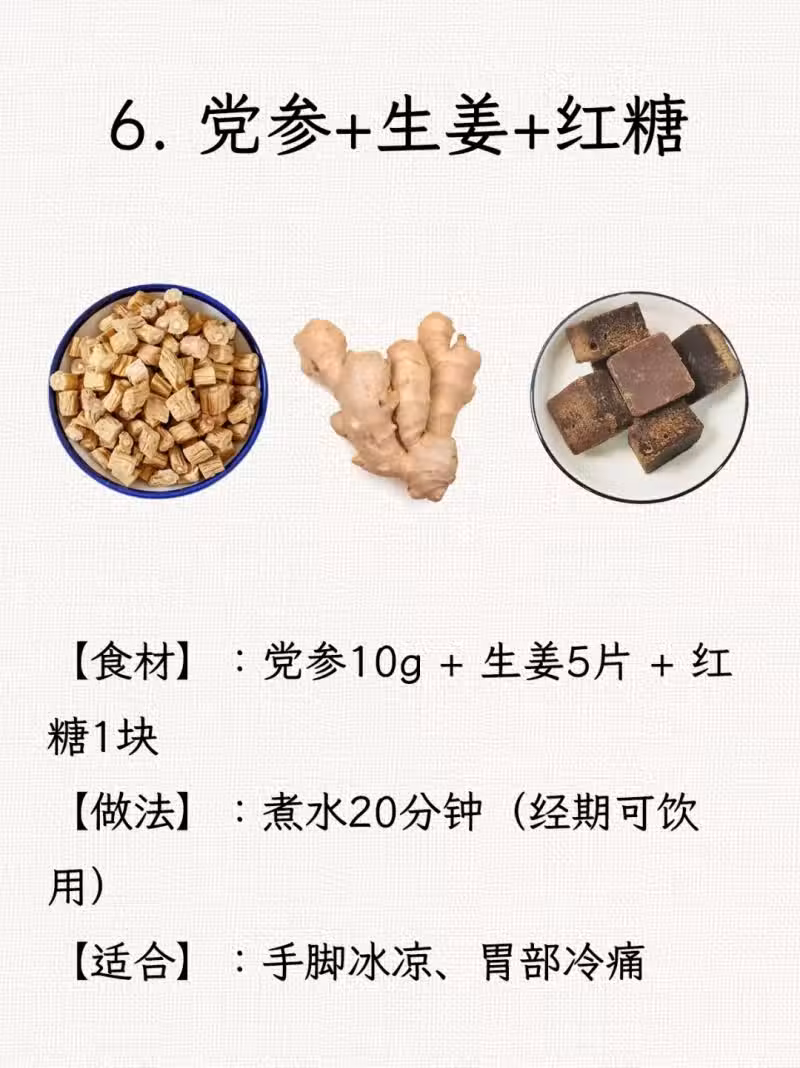 6. 黨參+生薑+紅糖:驅寒暖身,適合體寒人群