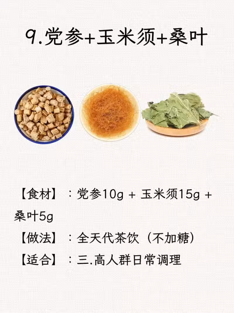 9. 黨參+玉米須+桑葉:清熱利尿,輔助調節代謝
