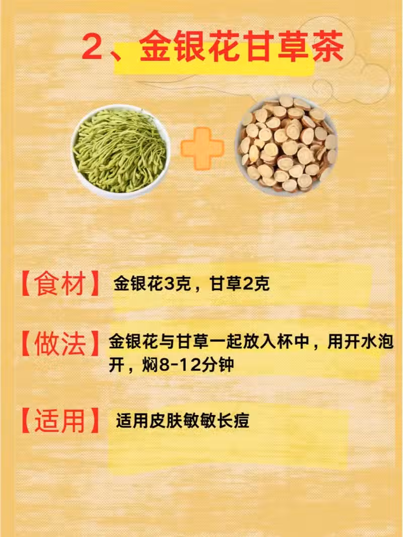 甘草調和藥性,與金銀花搭配,能在清熱祛痘的同時溫和養護脾胃,緩解熬夜後的咽干、冒痘煩惱,口感甘甜更易入口。