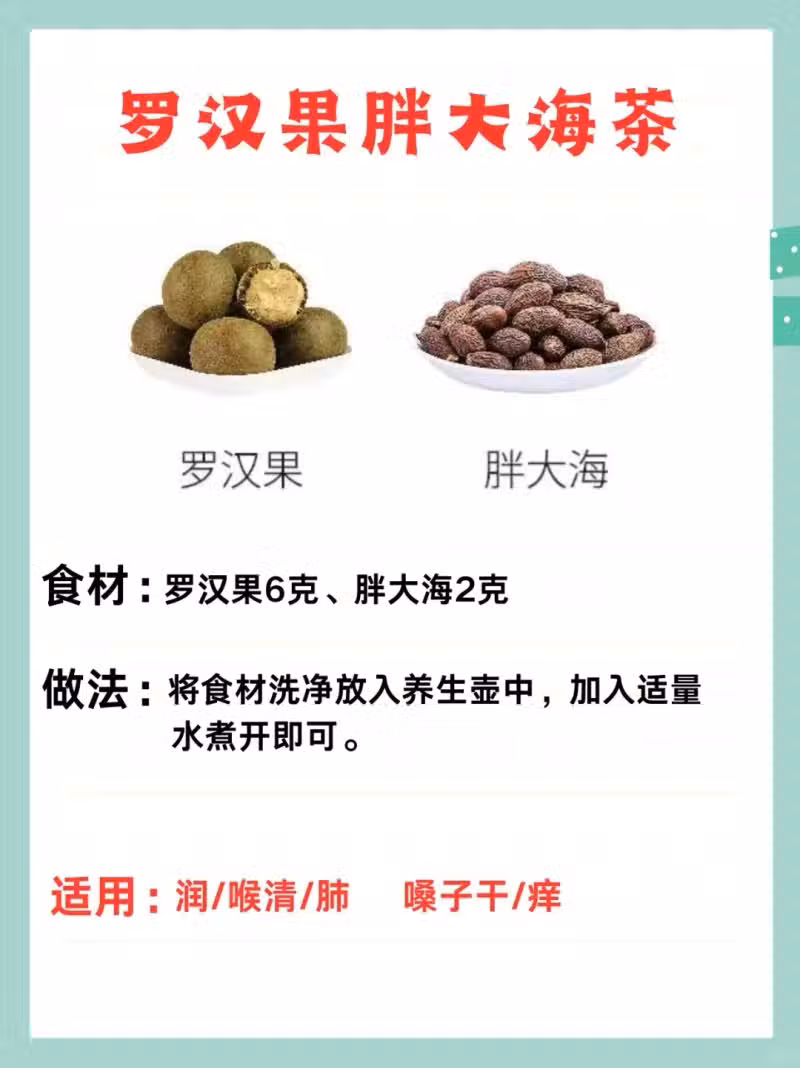 羅漢果與胖大海按比例搭配,熱水沖泡燜10分鐘。這對「黃金搭檔」堪稱咽喉的「急救站」,嗓子嘶啞、腫痛時來上一杯,迅速舒緩不適,還原清爽嗓音。