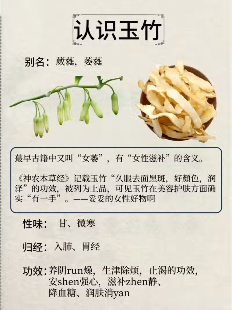 「林中生玉竹,月下美人來。」 今天,我要帶大家認識一位隱匿在山林間的 「寶藏仙子」 ——玉竹。這可不是一般的植物,它集美貌與才華於一身,千百年來,一直是中醫典籍里備受推崇的養生好物 。