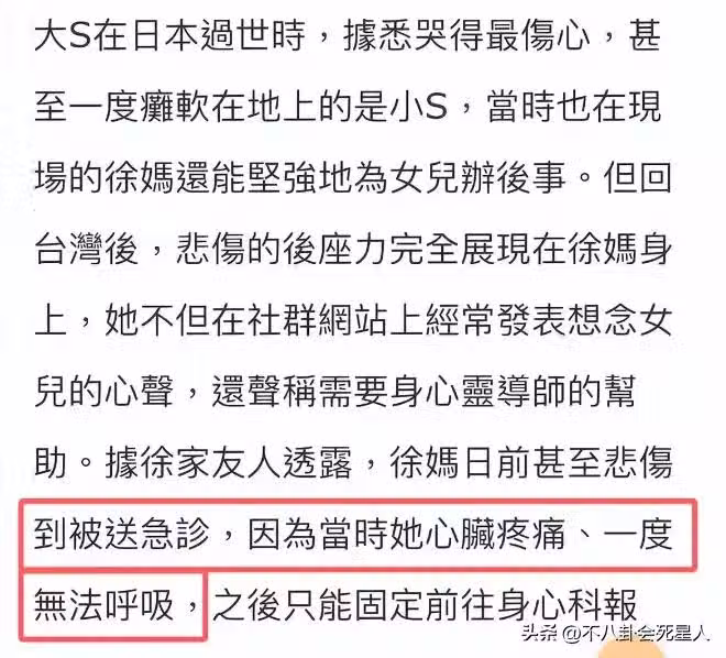 台媒曝大S媽突發心臟痛入院,大S離世重創S家,徐熙娣也難支撐