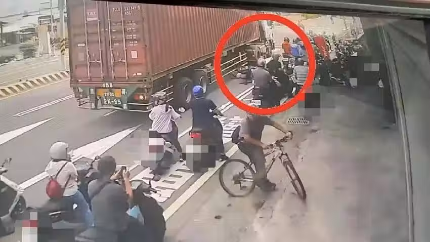 亡命瞬間曝光!連人帶車遭貨櫃車輪輾過,當場爆頭死亡!20多人目睹不敢撇頭