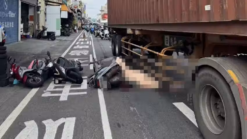亡命瞬間曝光!連人帶車遭貨櫃車輪輾過,當場爆頭死亡!20多人目睹不敢撇頭