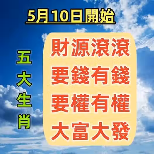 5月10日開始財源滾滾,要錢有錢,要權有權,大富大發的五生肖
