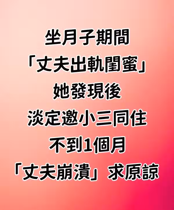 坐月子期間「丈夫出.軌閨蜜」!她發現後淡定邀小三同住 不到1個月「丈夫崩潰」求原諒
