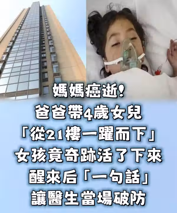 媽媽癌逝!爸爸帶4歲女兒「從21樓一躍而下」女孩竟奇蹟活了下來,醒來後「一句話...」讓醫生當場破防!